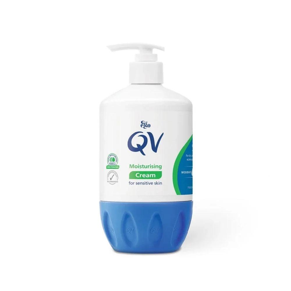 كريم كيوفي مرطب يتميز بتصميمه العملي، حيث يأتي في عبوة كبيرة مزودة بضخ، مما يسهل استخدامه. يمكن ملاحظة اللون الأبيض مع قاعدة زرقاء، مما يضفي لمسة من الانتعاش على طاولة الحمام.